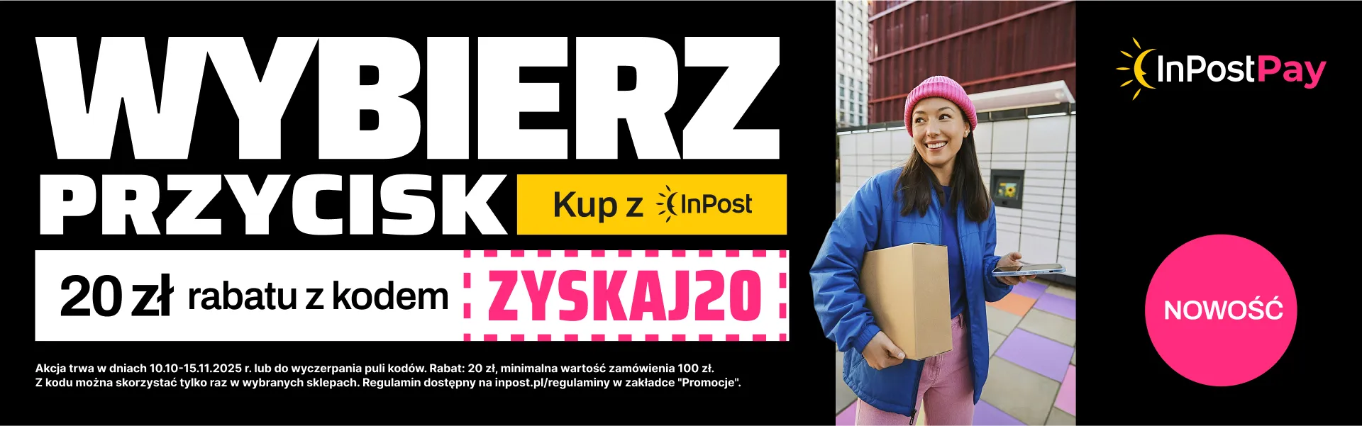 Promocja z kodem ZYSKAJ20 trwa 10.10-15.11.2025 (lub do wyczerpania puli kodów). Obowiązuje w wybranych, nowych sklepach. Minimalna wartość zamówienia 100 zł. Regulamin znajdziesz w zakładce „Promocje” na inpost.pl/regulaminy.