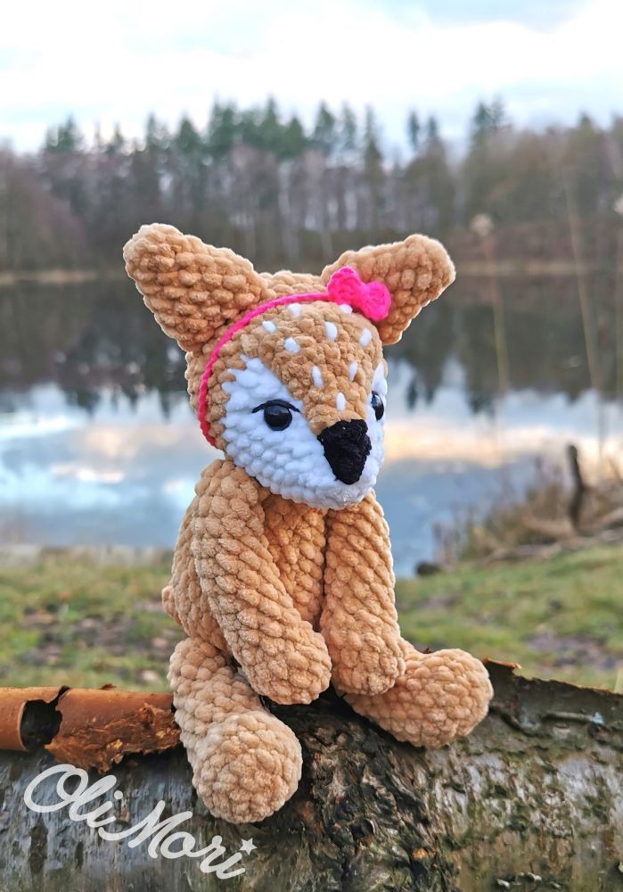 - Yarnart Jeans (50g/160m, 55% bawełna, 45% akryl) kawałek koloru czarnego do wyszycia linii rzęs nad okiem, uśmiechu i X w miejscu pępka; kawałek koloru różowego (lub innego) do zrobienia opaski dla sarenki
