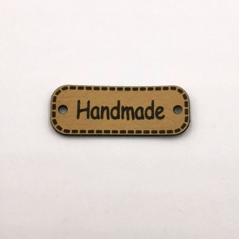Metka z ekoskóry z napisem „Handmade” w kształcie wydłużonego prostokąta z zaokrąglonymi rogami z obwódką w postaci przerywanych kresek.