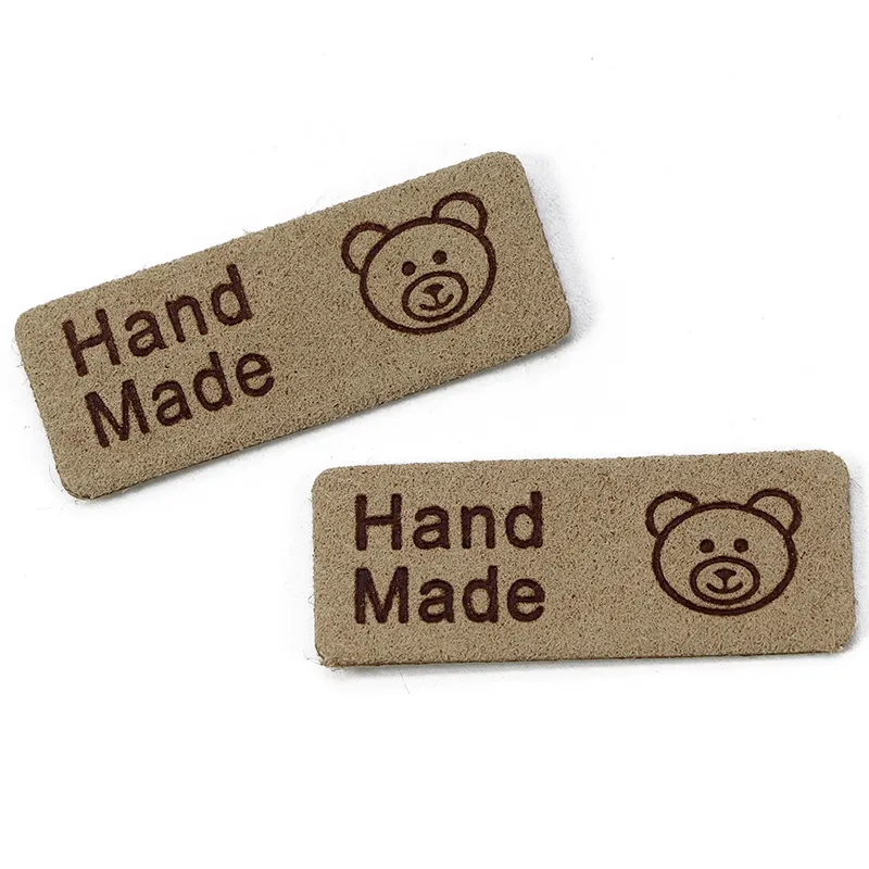 Metka z zamszu z napisem „Handmade” w kształcie wydłużonego prostokąta z zaokrąglonymi rogami i wizerunkiem misia.