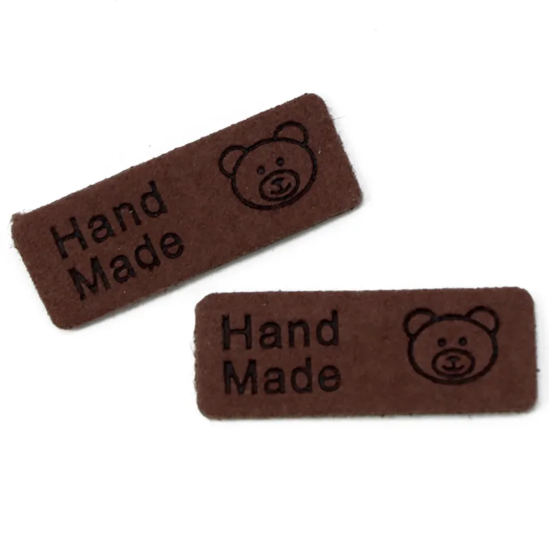 Metka z zamszu z napisem „Handmade” w kształcie wydłużonego prostokąta z zaokrąglonymi rogami i wizerunkiem misia.