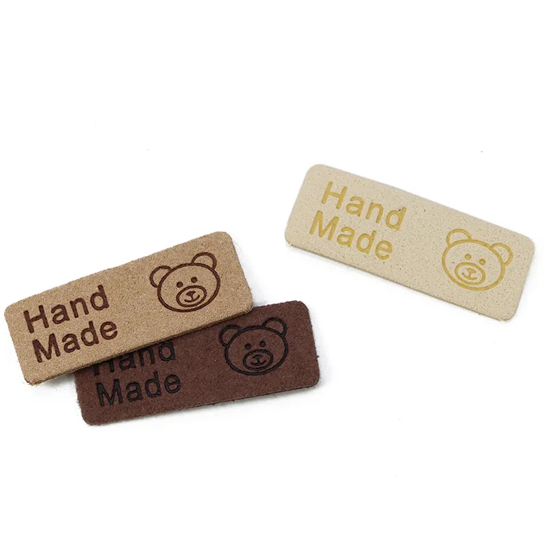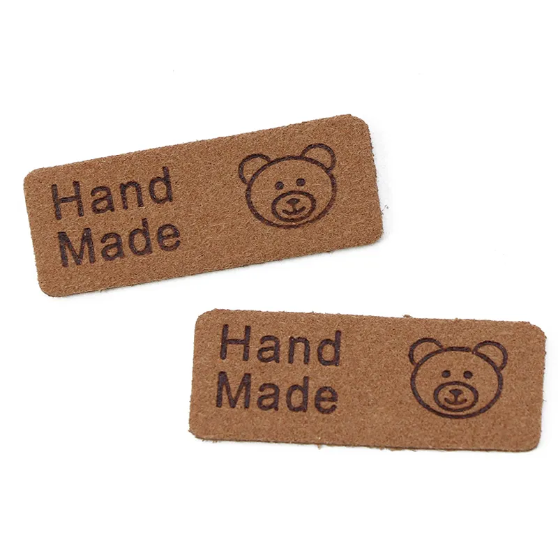 Metka z zamszu z napisem „Handmade” w kształcie wydłużonego prostokąta z zaokrąglonymi rogami i wizerunkiem misia.