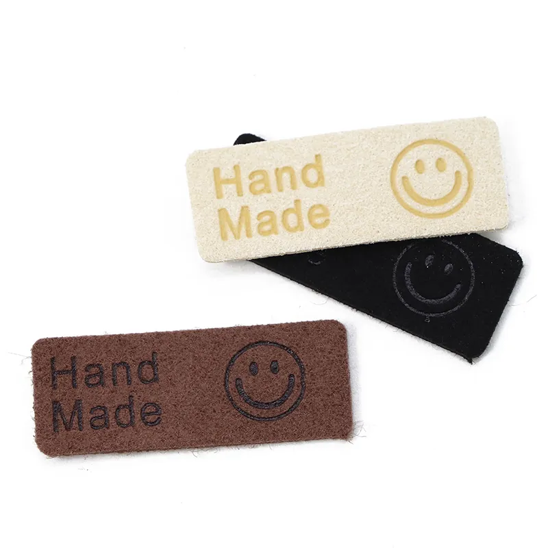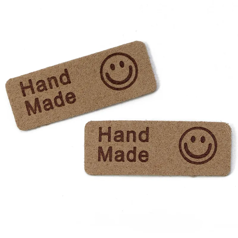 Metka z zamszu z napisem „Handmade” w kształcie wydłużonego prostokąta z zaokrąglonymi rogami i uśmiechniętą buzią.