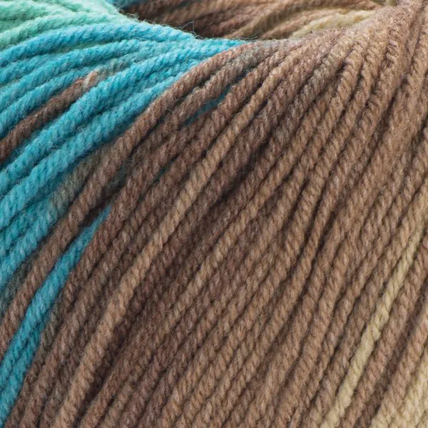 To kolorowa wersja klasycznego Jeans — posiada wielobarwne przejścia, które tworzą ciekawy efekt podczas dziergania bez konieczności zmiany włóczki.