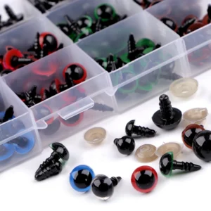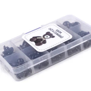 Plastikowe oczy mają średnicę 8, 10, 12, 15 i 18 mm. Dostępne są w trzech różnych i bardzo przystępnych kompletach 3 różnych kolorów oczu po 4 x oczka (2 pary) na rozmiar (łącznie 30 par!) w poręcznym pudełku do sortowania.