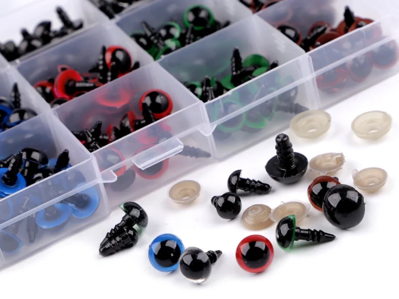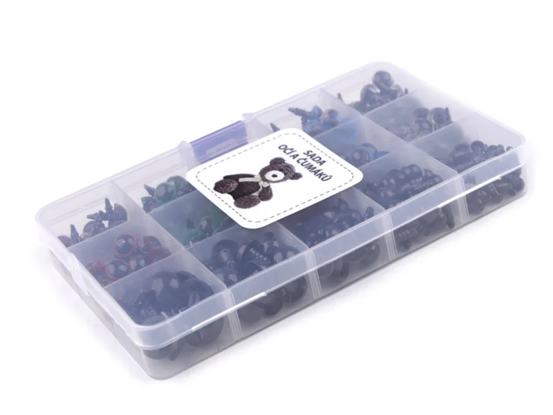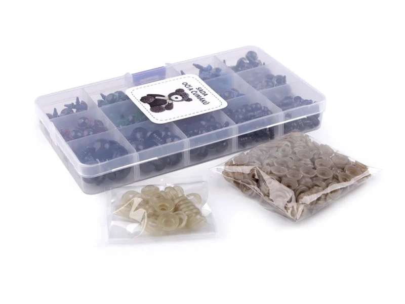W zestawie znajdują się oczy w różnych rozmiarach i kolorach, umieszczone w praktycznym pudełku z przegródkami, co ułatwia organizację i przechowywanie. Zawiera 10 przegródek z oczami z tęczówką o średnicy 10 mm w pięciu różnych kolorach oraz 5 przegródek z czarnymi oczami o średnicach 6, 7,5, 10 i 12 mm.
