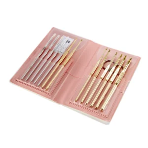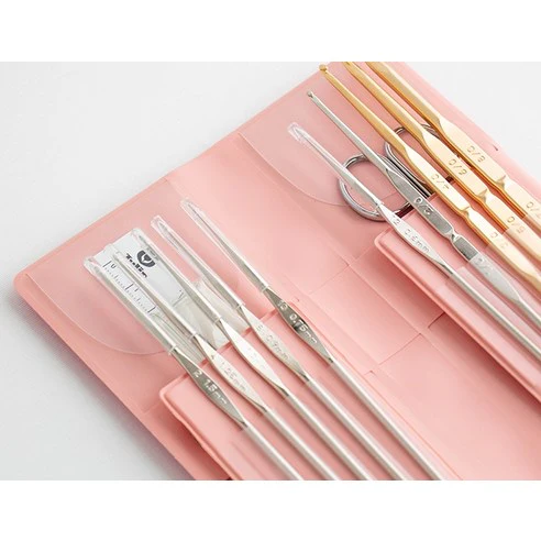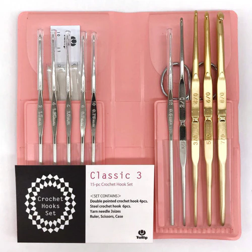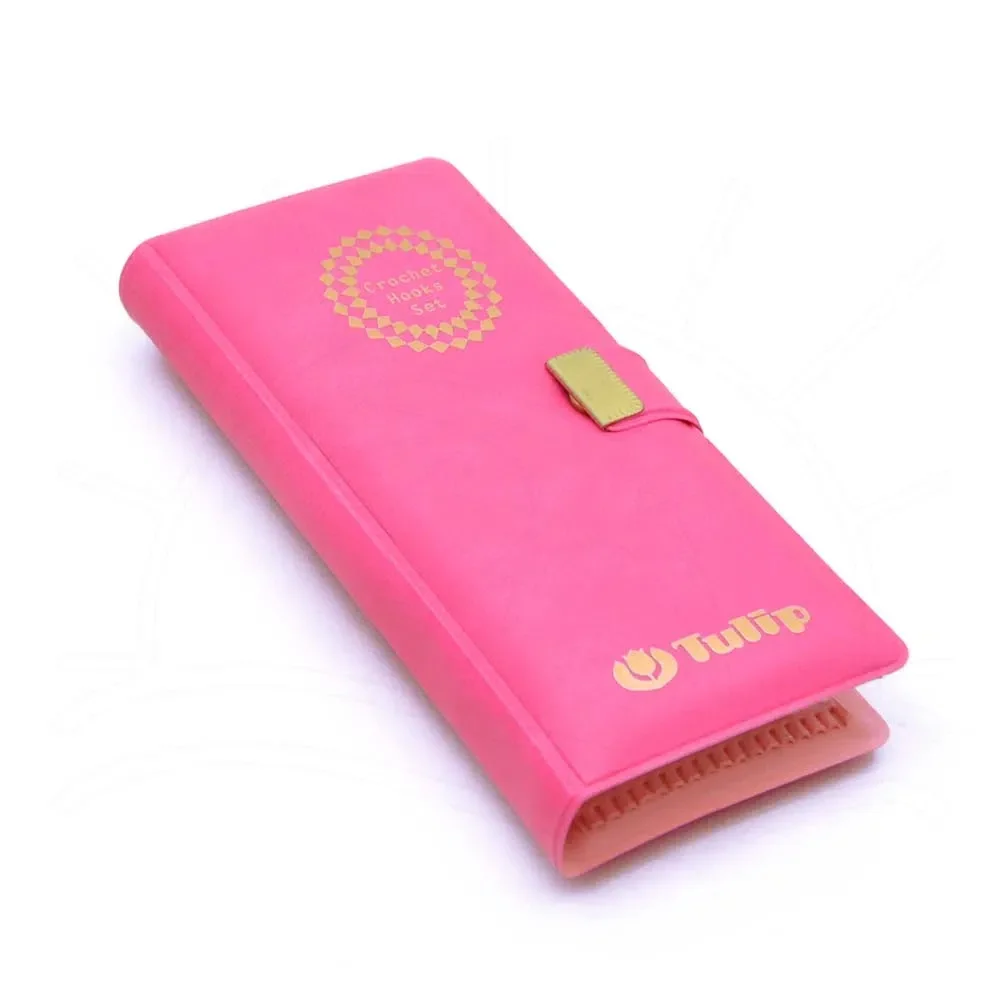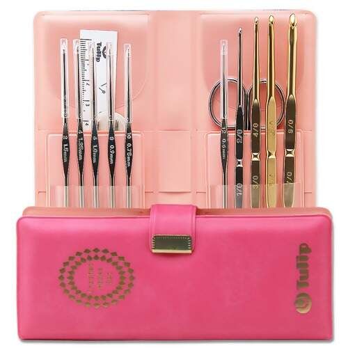 Zestaw klasycznych szydełek od japońskiej marki Tulip w różnych rozmiarach wraz z poręcznym etui i paroma akcesoriami.