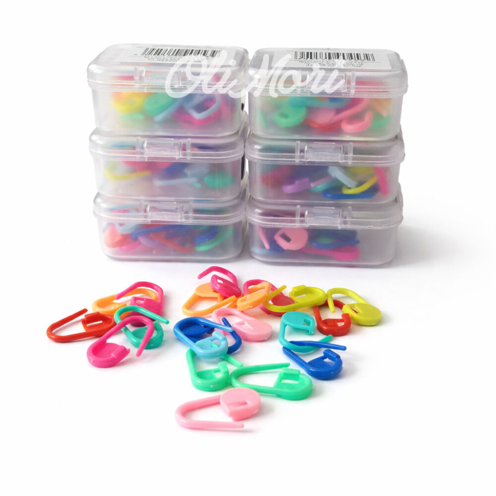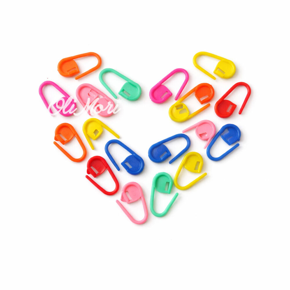 Wykonane z lekkiego, wytrzymałego plastiku, posiadają wygodne zamknięcie typu agrafka, dzięki czemu łatwo je przypiąć i zdjąć bez ryzyka uszkodzenia włóczki. Kolory dobierane są losowo – każdy zestaw jest różnorodny, co ułatwia oznaczanie różnych miejsc w projekcie.
